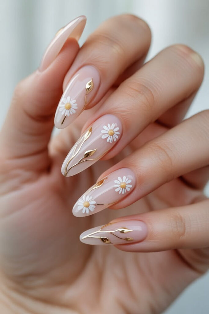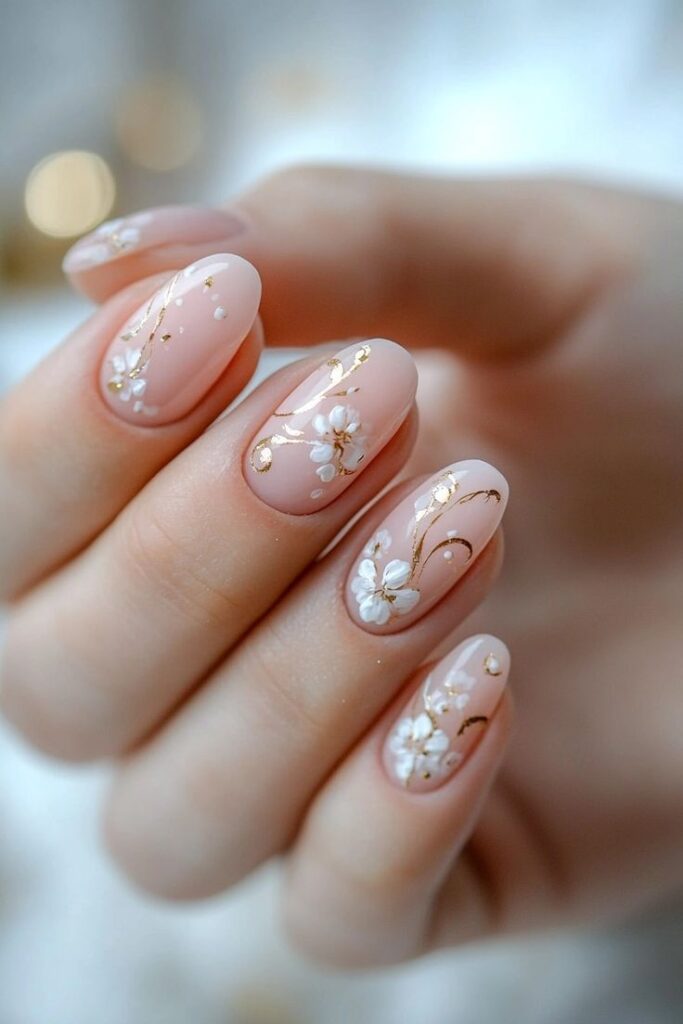 There is a hidden magic in the look of this nail design—something you can surely see for yourself. It features a polish in a soft, light pink shade, accented with golden leaf motifs that evoke the theme of a serene and peaceful wedding. To top it off, the addition of white floral details gives the look a truly cool and chic vibe.